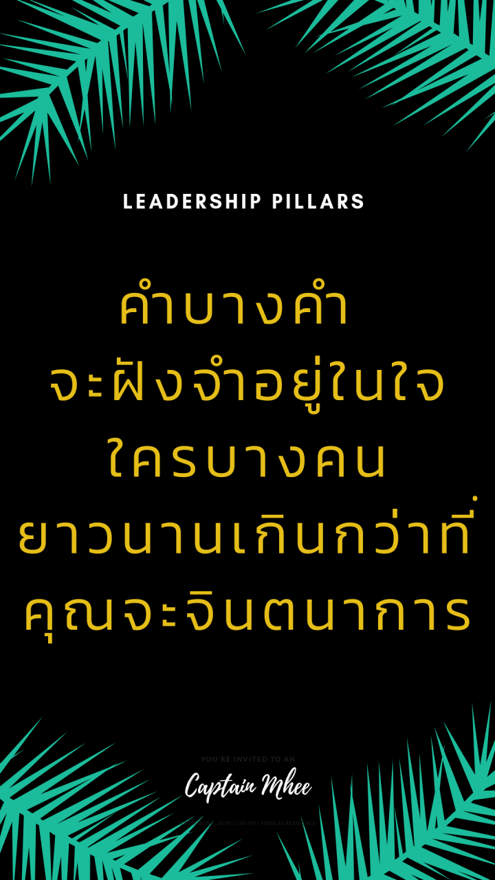 Communication, inspiration LEADERSHIP PILLARS : “Communication” 9 Jan 20198 Sep 2019by Captain Mhee “คำพูดเหมือนตะปูตอกลงที่ฝาผนัง แม้ถอนมันออกไป ยังไงมันก็เหลือร่องรอย” Share this: Click to share on X (Opens in new window) X Click to share on Facebook (Opens in new window) Facebook Click to share on LinkedIn (Opens in new window) LinkedIn More Click to share on Pinterest (Opens in new window) Pinterest Click to email a link to a friend (Opens in new window) Email Like Loading... Related