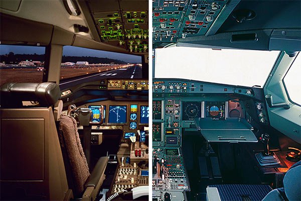 - ที่ชัดเจนสุดก็คือคันบังคับแอร์บัสใช้ Side stick อยู่ด้านข้างของนักบิน Boeing ใช้ Yoke หรือ Wheels อยู่ตรงด้านหน้าระหว่างเข่าของนักบิน